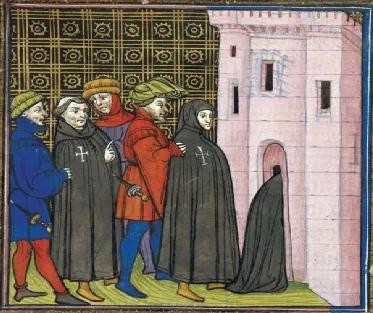 十字军东征结束后,圣殿骑士团的命运自然也很悲惨。残存的圣殿骑士团撤到塞浦路斯,再返回法国。圣殿骑士团在法国是国王的大债主,拥有几千座城堡和巨额财富,国王和主教十分羡慕与嫉恨,垂涎三尺。于是,法国国王腓力四世(路易九世的孙子)准备编织“异端”罪名去铲除他们。这是一名生性敏感多疑的国王,并有着极强的掌权欲。他一手扶持了愿意顺从法兰西国王的教宗克雷芒五世贝特朗,一生都致力于王权的掌控与加强。他在位时,正是法兰西经济混乱衰退的时候。于是乎,组织富有而又独立性强,不听国王命令的圣殿骑士团被盯上,由此遭受了灭顶之灾。