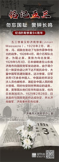 根据《中华人民共和国人民防空法》和《济南市人民政府关于加强防空警报设施管理工作的通告(济南市人民政府令第274号)》,定于2022年5月3日上午10时许在全市试鸣防空警报,以纪念济南惨案94周年。