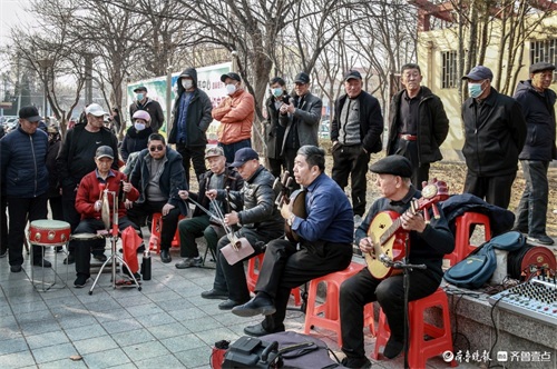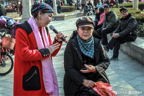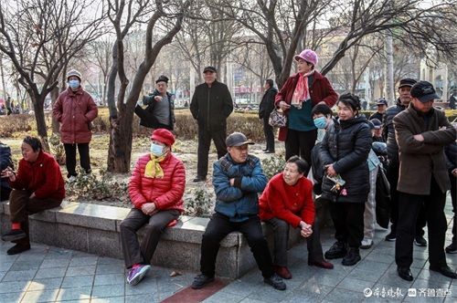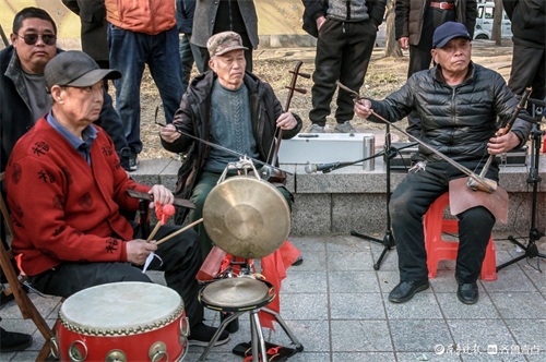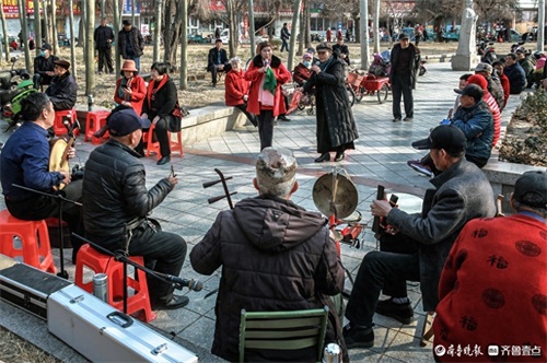 2月26日下午,在高密市文化广场,当地部分茂腔爱好者聚集在一起,唱起《小姑贤》等唱段。高密茂腔历史悠久,被列为国家非遗。 朱永平 摄
