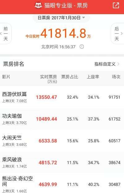 猫眼电影讯 根据猫眼专业版实时票房数据显示,《西游伏妖篇》于2017年1月30日16::12:24内地票房突破7亿大关,以绝对优势领跑春节档,助力单日大盘再次超4亿。《功夫瑜伽》单日入账再次过亿,累计3.7亿。《大闹天竺》以超6千万暂居第三。《乘风破浪》和《熊出没·奇幻空间》表现十分接近,均4千多万。