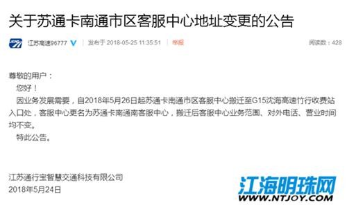 记者今日从@江苏高速96777官方微博获悉,因业务发展需要,自2018年5月26日起苏通卡南通市区客服中心搬迁至G15沈海高速竹行收费站入口处,客服中心更名为苏通卡南通南客服中心,搬迁后客服中心业务范围、对外电话、营业时间均不变。