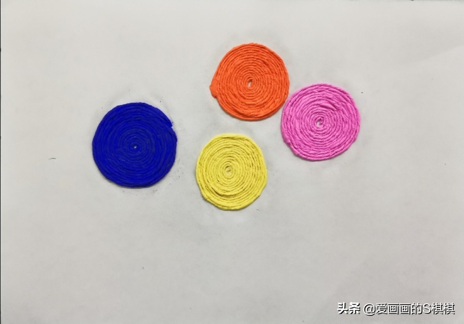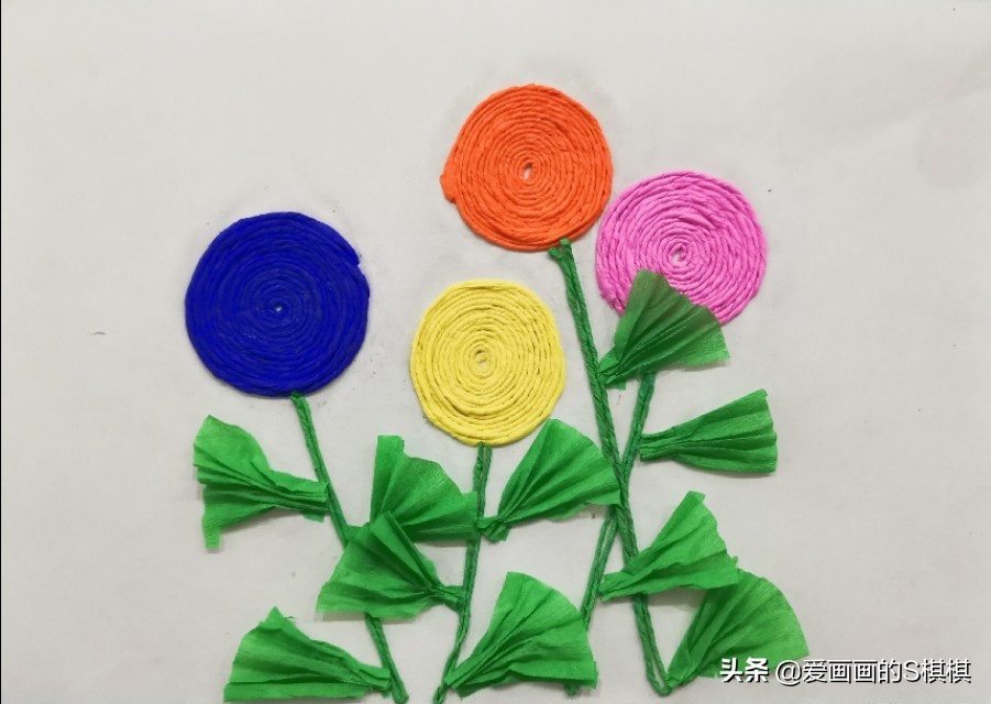 把用皱纹纸搓好的长条绳粘在纸上做花,粘的时候一圈一圈的围着粘,粘成圆形