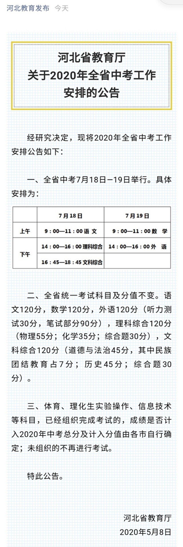 河北省教育厅发布公告,全省中考于7月18日—19日举行。具体安排↓↓↓