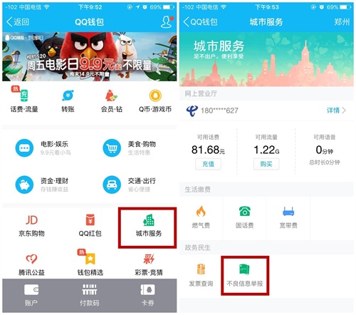 点左上角头像→QQ钱包→城市服务→不良信息举报。