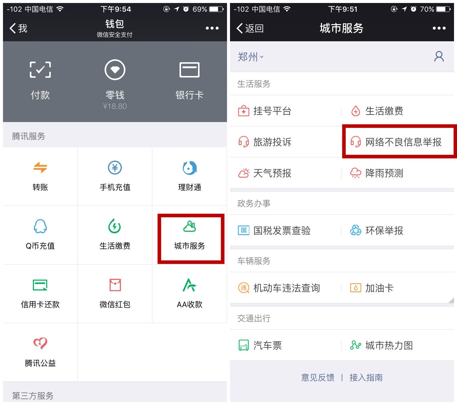 依次打开我→钱包→城市服务→网络不良信息举报。