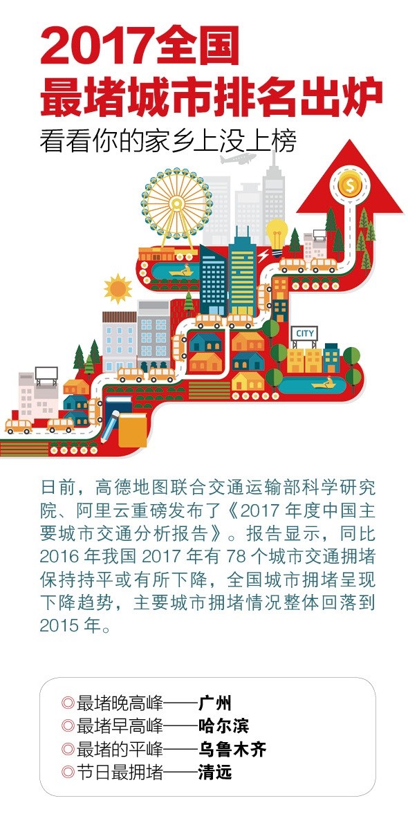 日前,高德地图联合交通运输部科学研究院、阿里云发布了《2017年度中国主要城市》交通分析报告,全国最堵城市排名出炉,看看你的家乡上榜没。