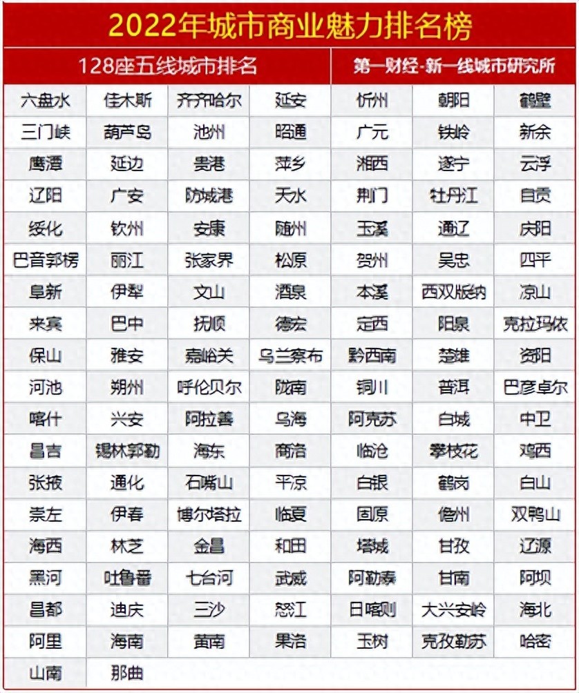 第一财经旗下的新一线城市研究所发布的《2022年城市商业魅力排名榜》中,五线城市总计128座。