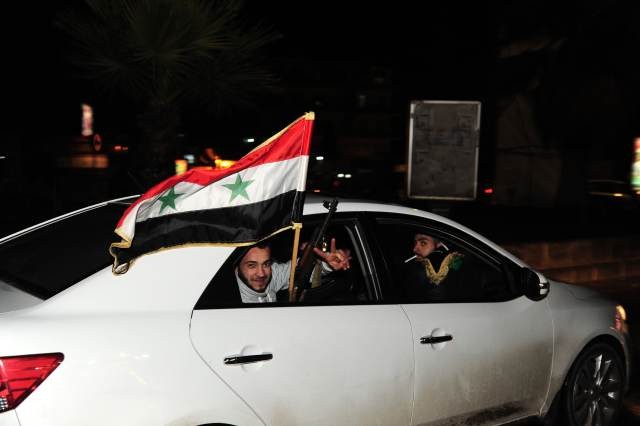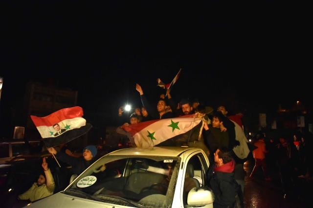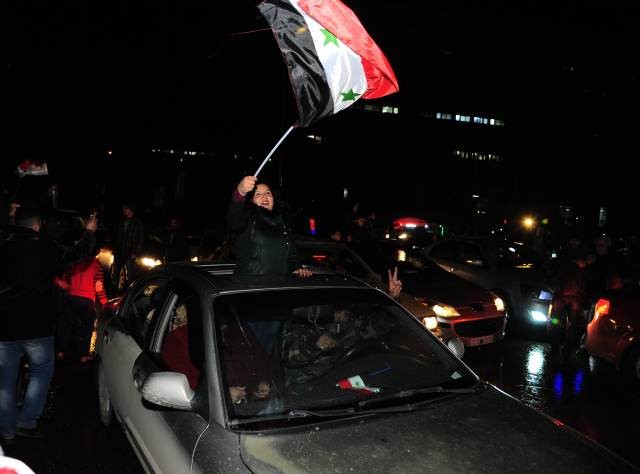 ↑ 在叙利亚北部城市阿勒颇,民众上街庆祝叙政府军收复该市。新华社发(阿马尔摄)