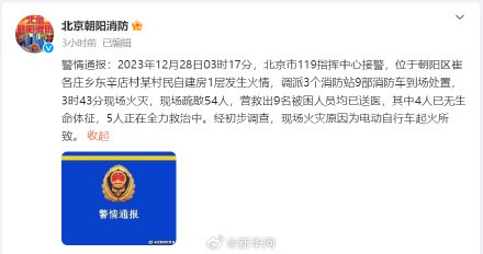 北京市朝阳区消防救援支队通报:2023年12月28日3时17分,北京市119指挥中心接警,位于朝阳区崔各庄乡东辛店村某村民自建房1层发生火情,调派3个消防站9部消防车到场处置,3时43分现场火灭,现场疏散54人,营救出9名被困人员均已送医,其中4人已无生命体征,5人正在全力救治中。经初步调查,现场火灾原因为电动自行车起火所致。