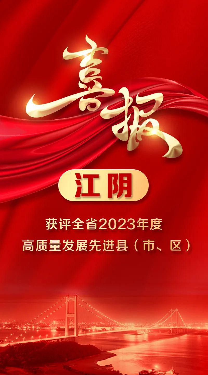 今天,全省2023年度高质量发展总结暨2024年工作推进会议召开,江阴获评全省2023年度高质量发展先进县(市、区)。