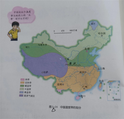 根据气候的南北差异,结合农业生产实际,以活动积温为主要指标,从北到南,习惯上将中国划分为寒温带、中温带、暖温带、亚热带和热带五个温度带。还有一个地高天寒、面积广大的高原气候区。