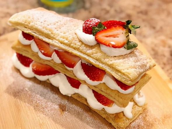 拿破仑蛋糕称之为一千层酥皮,使用工艺繁杂的起酥工艺。酥皮之间的夹层丰富。让我们来看看它的一个制作方法。