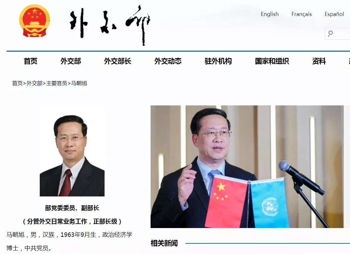 近日,外交部网站“主要官员”栏目更新显示:马朝旭已任外交部分管外交日常业务工作的副部长,明确为正部长级。