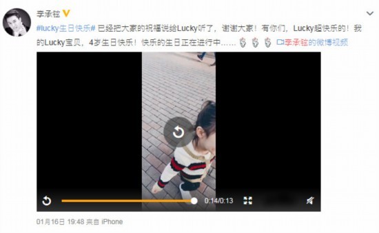 1月16日是李承铉和戚薇女儿Lucky4周岁生日,晚间,李承铉通过个人社交网站上传Lucky的可爱视频,并称:“已经把大家的祝福说给Lucky听了,谢谢大家!有你们,Lucky超快乐的!我的Lucky宝贝,4岁生日快乐!快乐的生日正在进行中……”