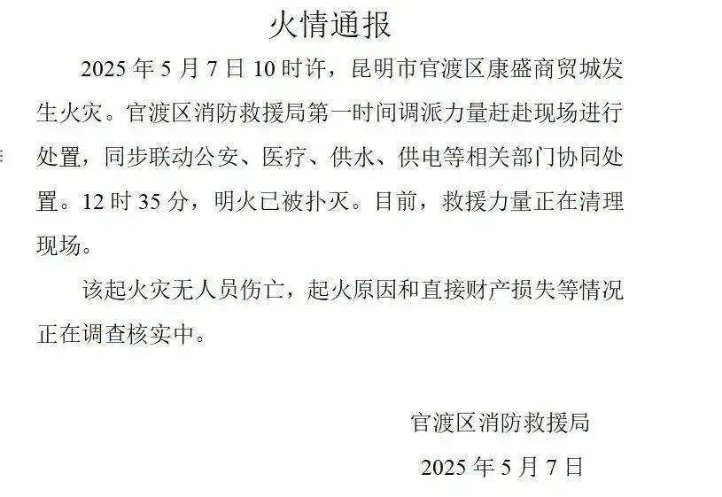 5月8日,据云南省消防救援总队消息,该起火灾发生后,辖区消防力量迅速响应,赶赴现场处置。火灾扑灭后,昆明市官渡区消防部门发布情况通报:5月7日10时许,昆明市官渡区康盛商贸城发生火灾。官渡区消防救援局第一时间调派力量赶赴现场进行处置,同步联动公安、医疗、供水、供电等相关部门协同处置。