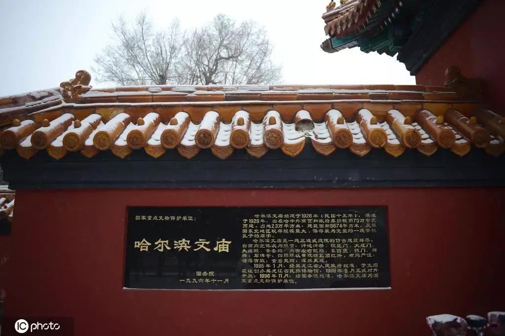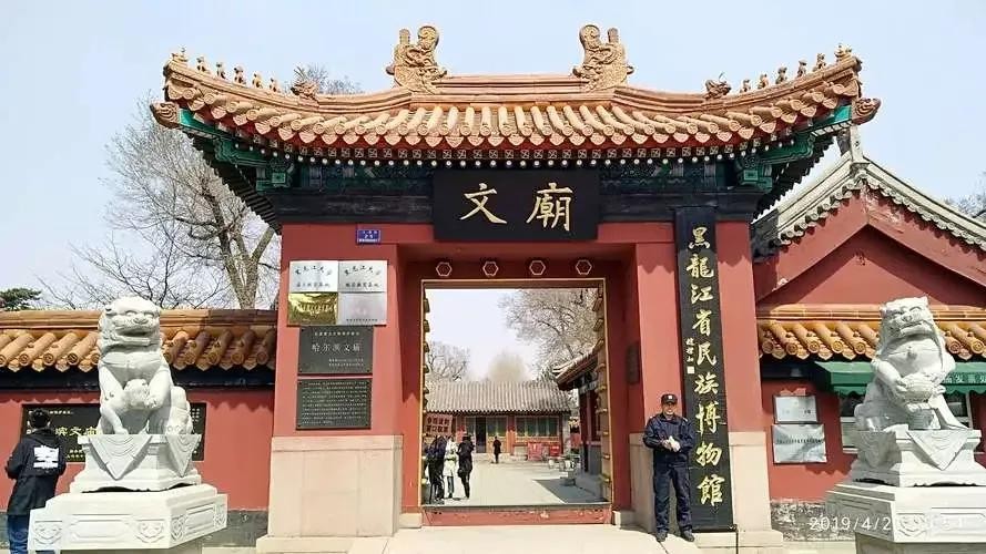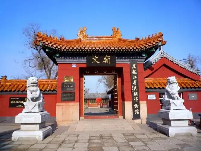 哈尔滨文庙座落在哈尔滨市南岗区文庙街,建于1926年。黑龙江省省级文物保护单位。占地面积6万平方米。由殿堂、两厢、门庑和围墙组成三进院落,层次井然,轩昂凝重,庄严肃穆。前院为棂星门院,中院为大成殿,后院为书厅院。三重正殿均用金黄琉璃瓦顶,配殿分别为青绿、灰瓦顶,金碧辉煌富于变化,殿内彩绘富丽堂皇。整个建筑采用中国民族建筑的形式结构,是黑龙江省现存规模最大、最完整的仿古建筑群,对研究古代建筑艺术风格和古代的建筑艺术具有重要价值。是市一类保护建筑。