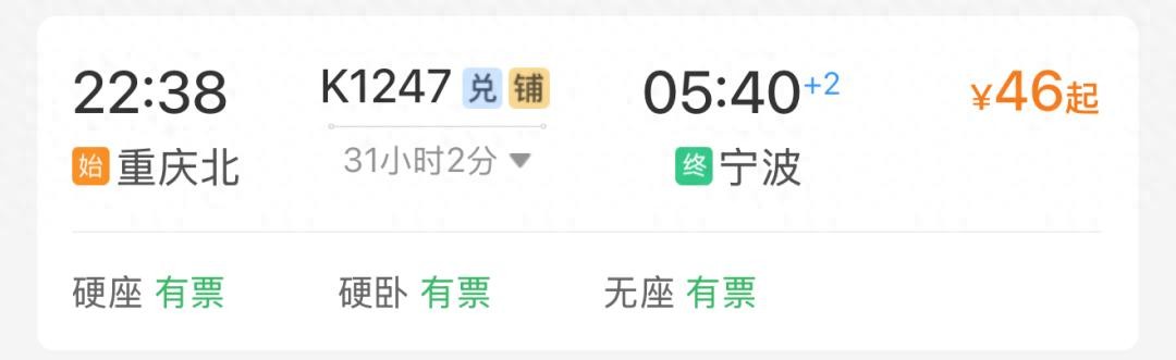记者从铁路12306了解到,1月24日起,重庆北开往宁波的K1247次列车车票目前最新是打2折起售,硬座全程仅需46元,硬卧目前是5折最低203元。这趟车22:38从宁波出发,第三天早晨5:40到达宁波站,全程31小时2分。