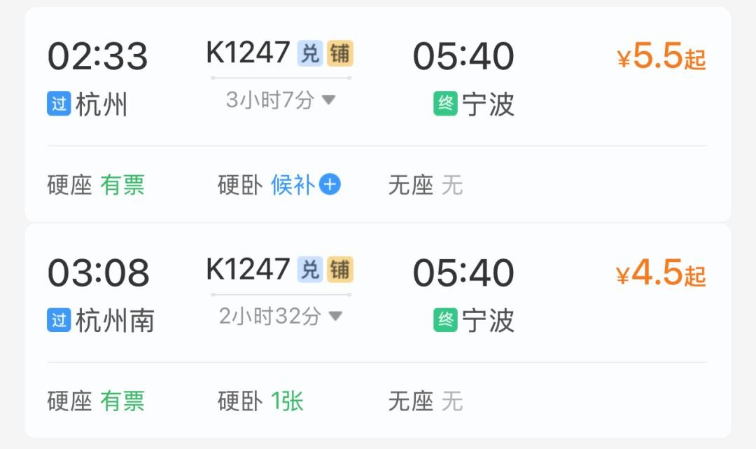值得一提的是,这趟车杭州到宁波,凌晨2:33从杭州上车,5:40到达宁波,硬座同样是2折,5.5元;杭州南站到宁波更是仅需4.5元。