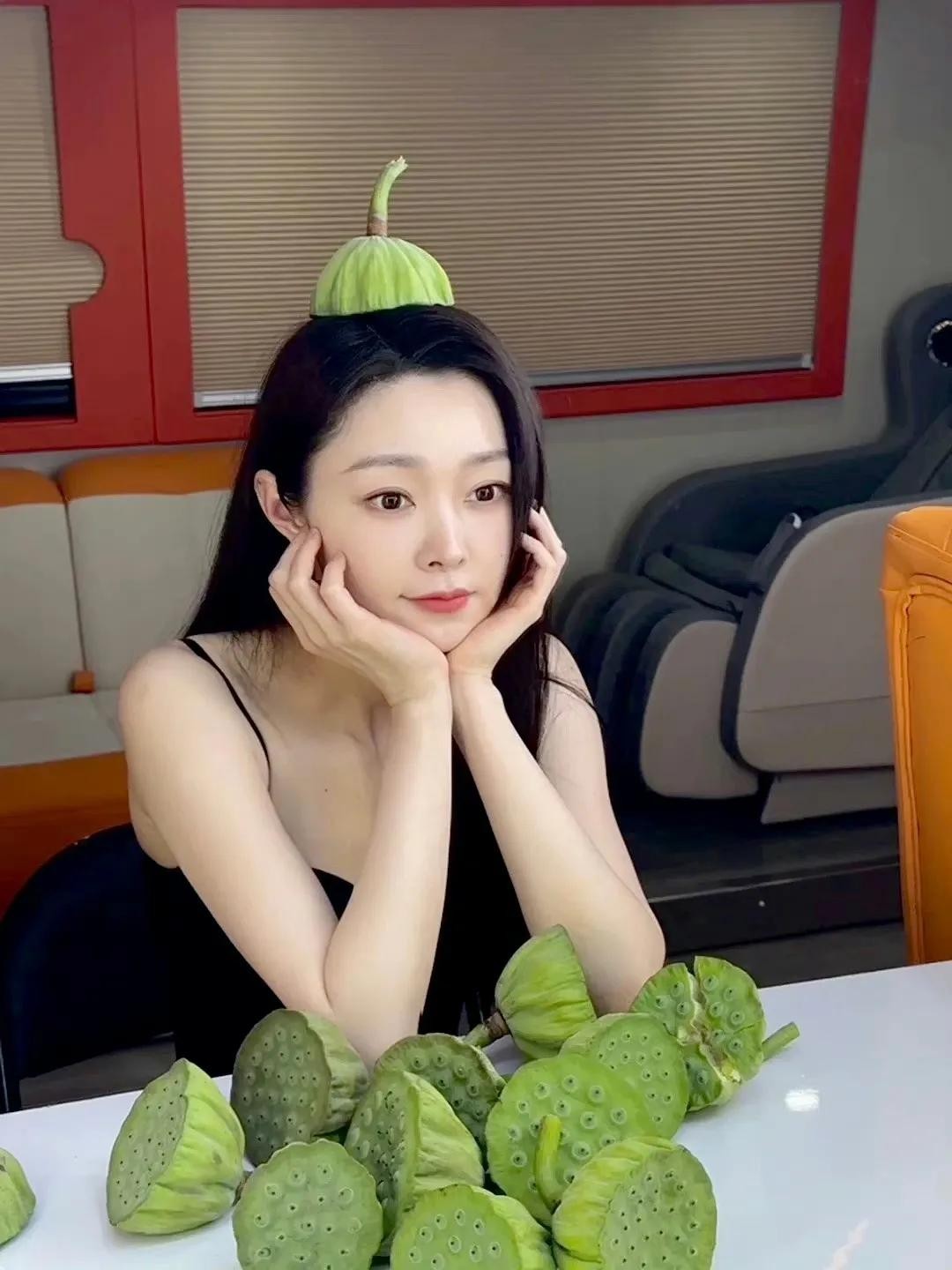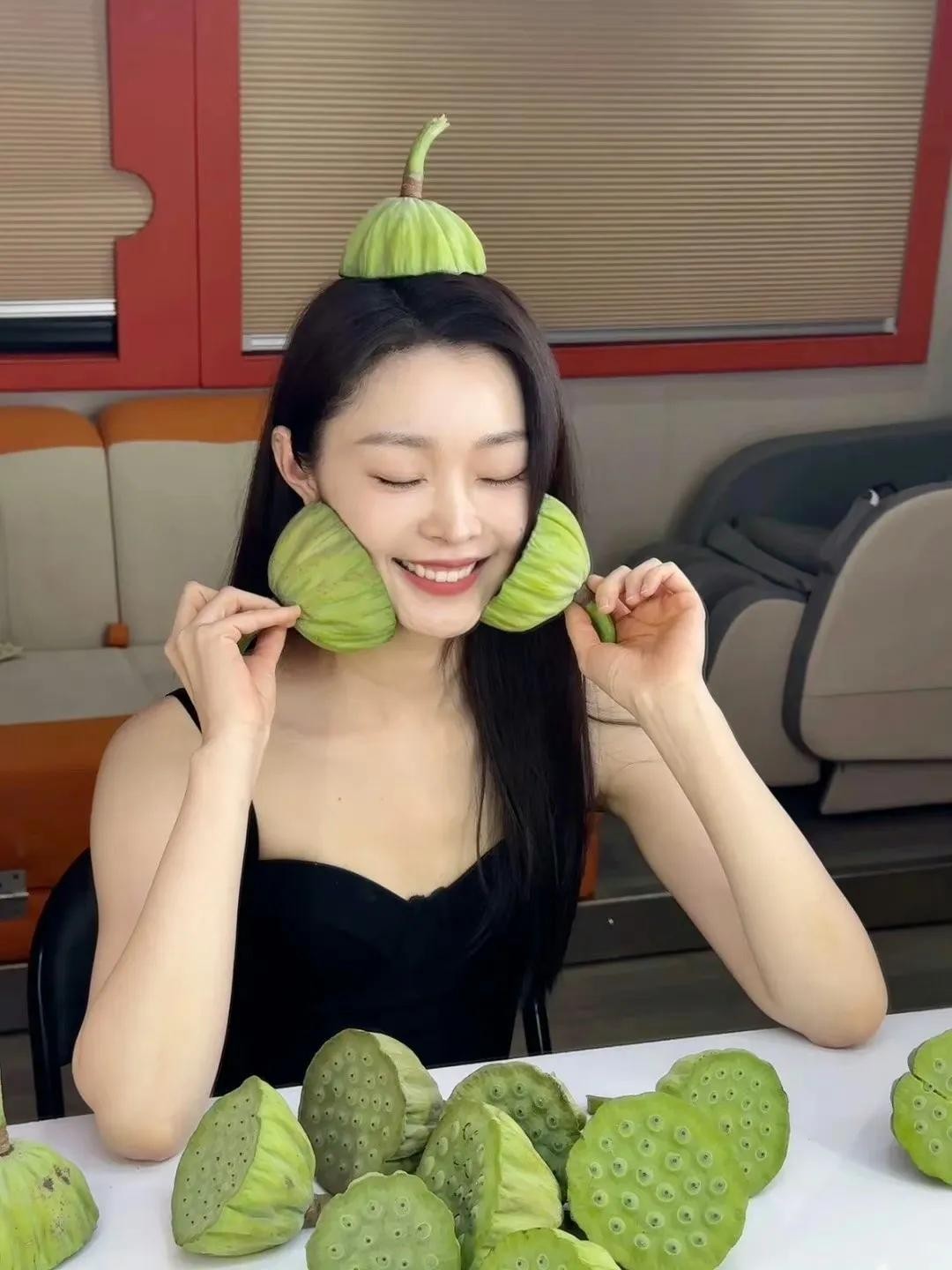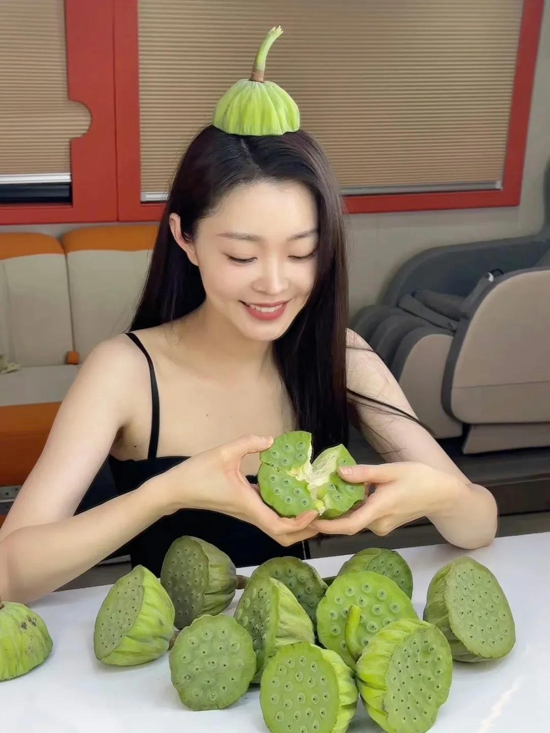 宋轶晒与莲蓬合照 头顶莲蓬手剥莲蓬好俏皮可爱!