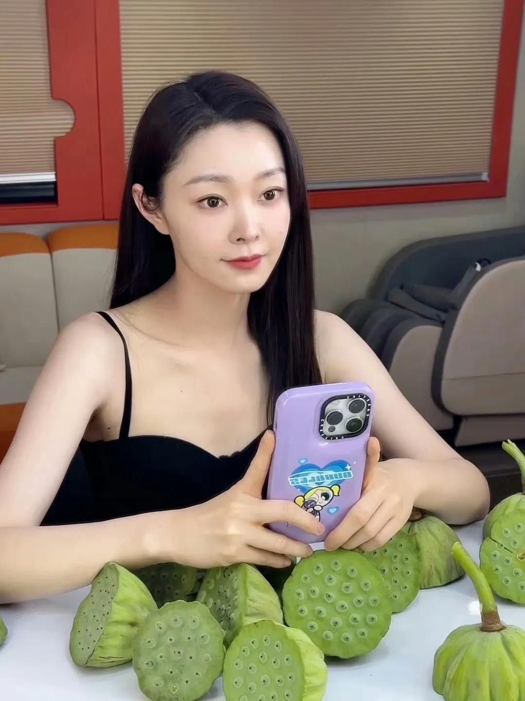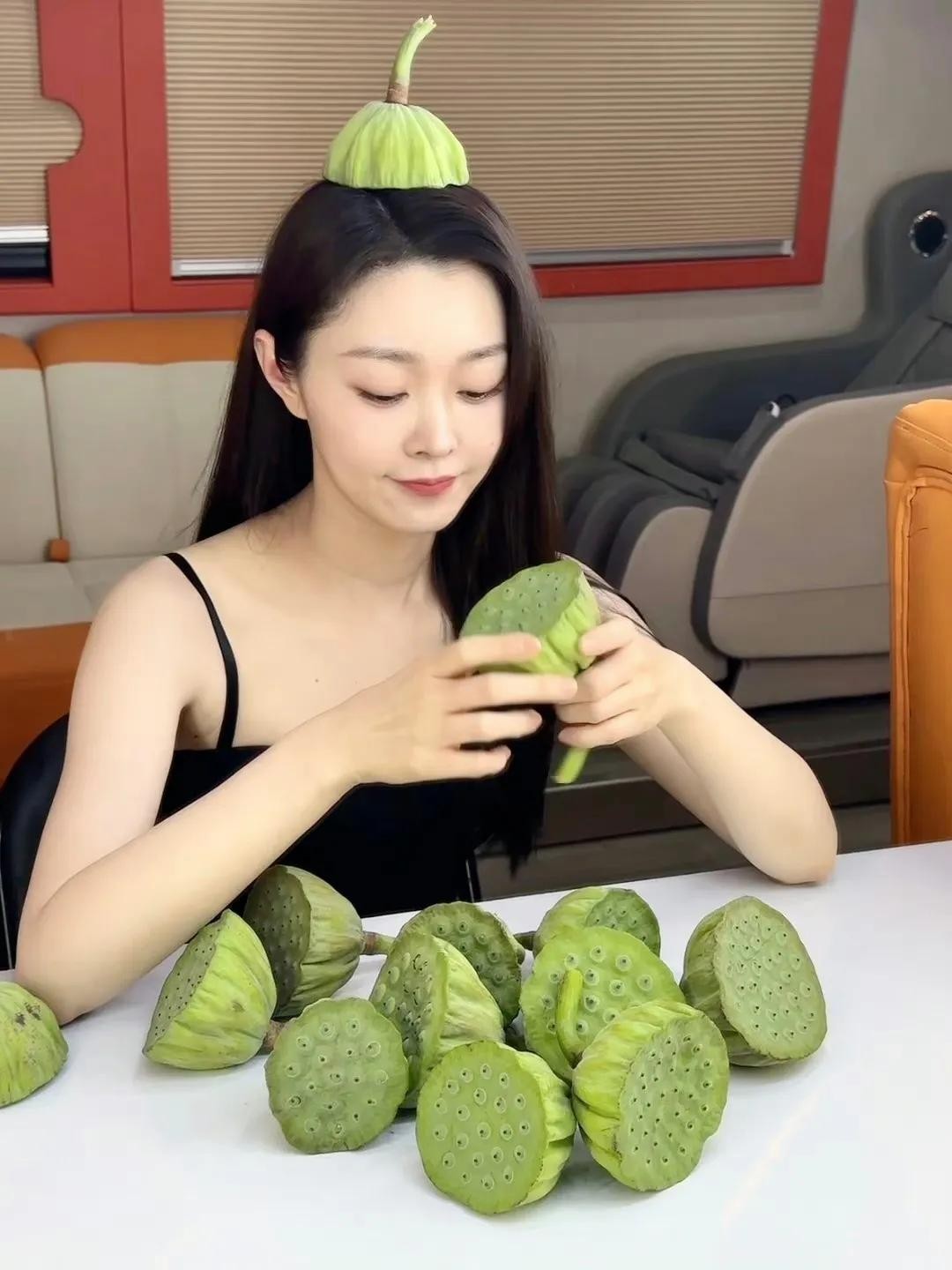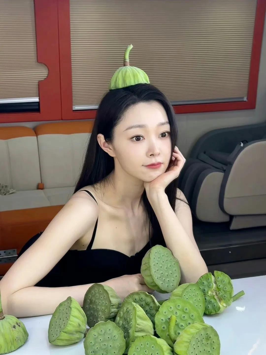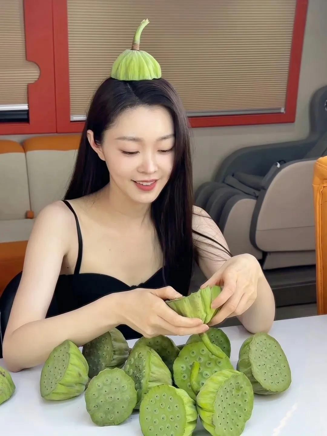宋轶晒与莲蓬合照 头顶莲蓬手剥莲蓬好俏皮可爱!