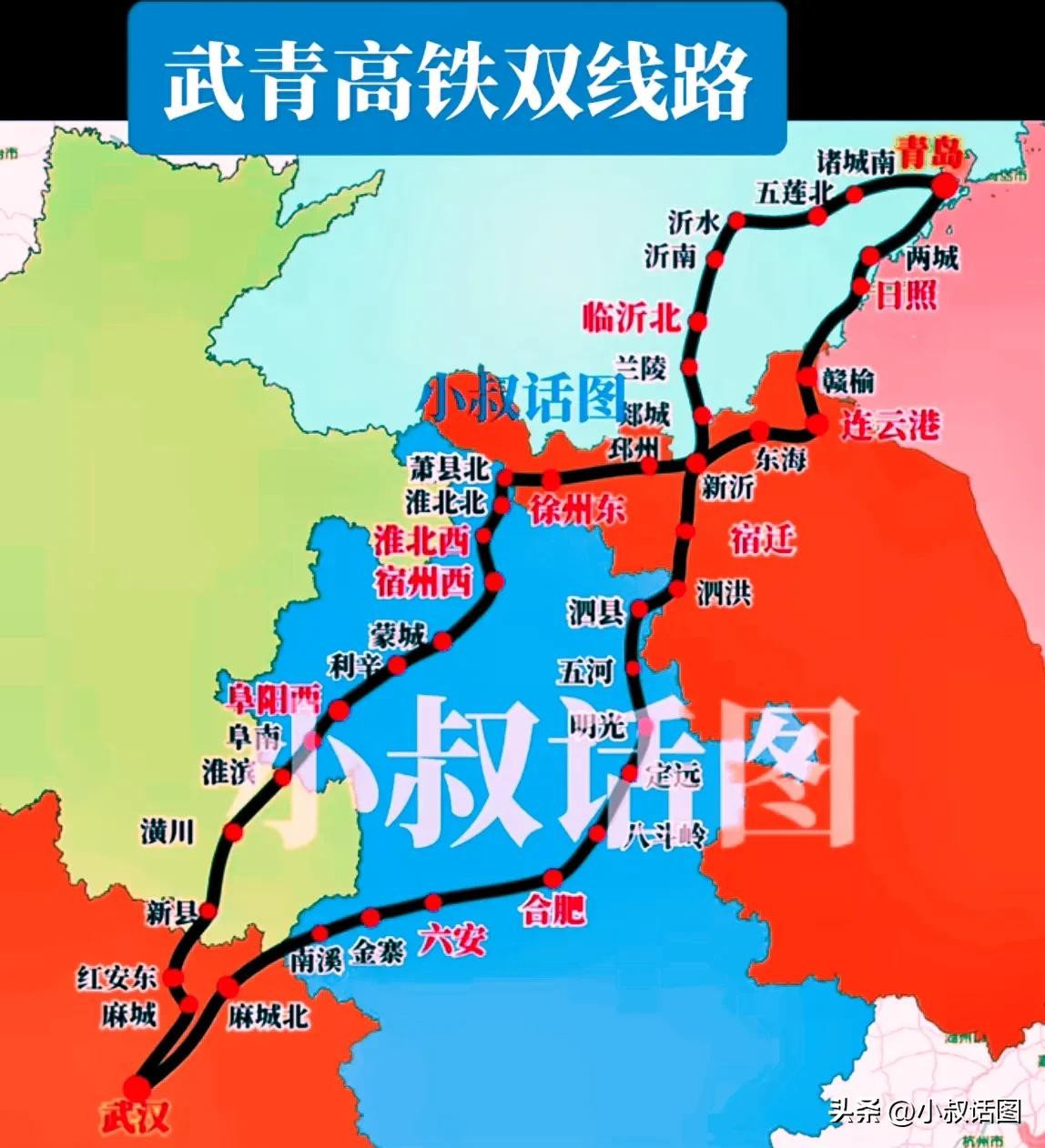 线路二则是通过武汉、阜阳、淮北、宿州、临沂终到山东青岛,这个方案虽然途经多个人口超700万的大城市,意义重大。