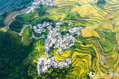 人民网贵阳9月14日电 (记者涂敏) 9月12日,贵州省贵阳市花溪区高坡苗族乡梯田内稻谷即将收获。层层叠叠的金黄色稻田与民居、乡村小道交相辉映,呈现一幅美丽的秋日画卷。