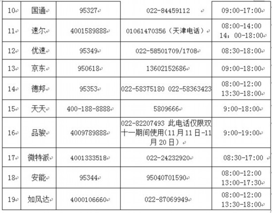 为扎实做好“双十一”寄递业务旺季期间寄递服务保障工作,切实保障消费者合法权益,天津市邮政管理局公布2018年“双十一”业务旺季天津市主要寄递企业客服电话。消费者在遇到相关问题时,可以拨打以下客服电话进行咨询、查询或投诉,对企业处理投诉结果不满意的,可拨打8890便民服务热线或12305邮政业消费者申诉热线。(记者赵颖妍)