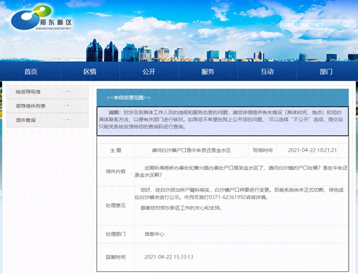 4月22日,郑东新区管委会官方网站显示,有市民询问白沙镇户口是中牟县还是金水区?
