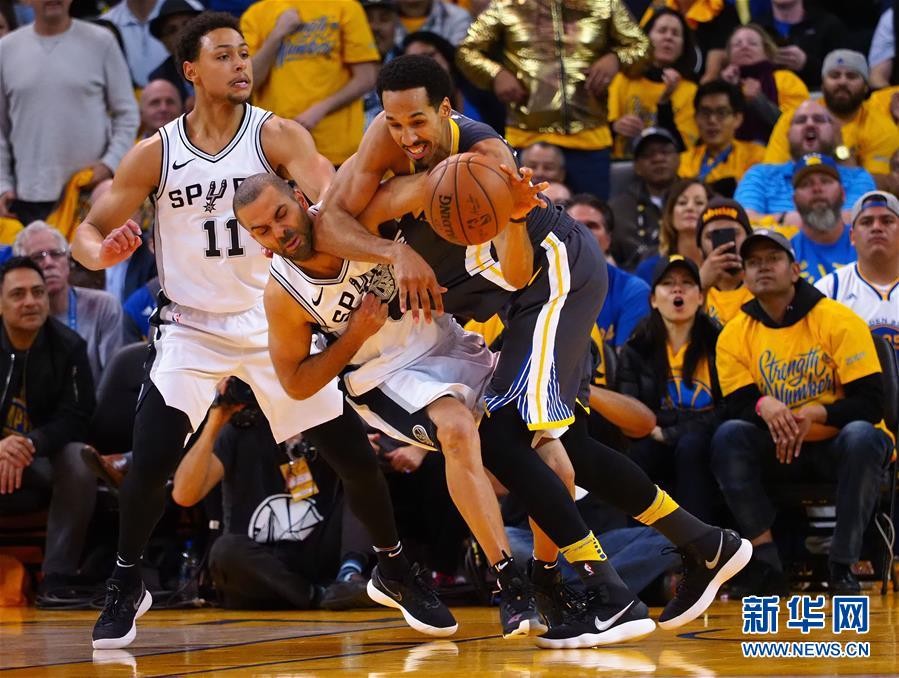 ↑4月16日,勇士队球员利文斯顿(右)和马刺队球员帕克(中)在比赛中拼抢。新华社/路透