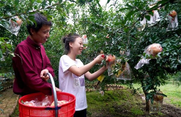 10月2日,游客在临潼丰乐石榴种植专业合作社的百年石榴园内采摘石榴。新华社记者 刘潇 摄