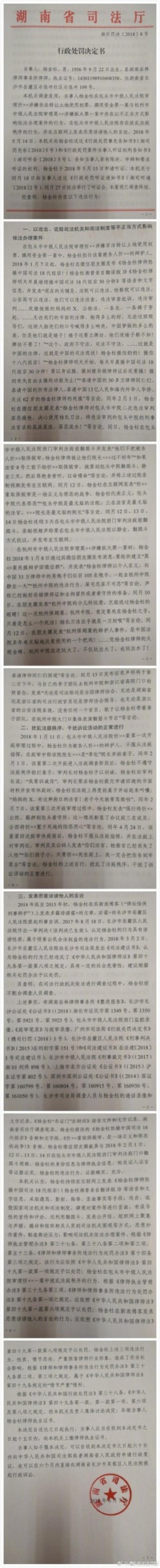 【湖南司法厅正式吊销杨金柱律师证 后者曾高调介入杭州保姆纵火案】昨晚,湖南司法厅正式吊销杨金柱律师证,并公布行政处罚决定书全文:调查发现,当事人杨金柱在包头市中级人民法院审理忻xx涉嫌非法转让土地使用权罪、挪用资金罪一案与杭州市中级人民法院审理莫xx涉嫌纵火罪一案中存在以不正当方式影响依法办理案件的行为,在包头市中级人民法院存在扰乱法庭秩序的行为,并在互联网上发表恶意诽谤他人的言论。