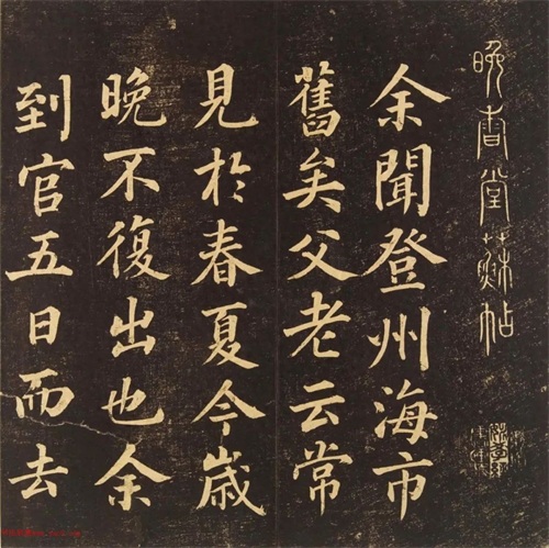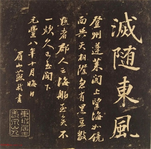 登州蓬莱阁上,望海如镜面,与天相际。忽有如黑豆数点者,郡人云:海舶至矣!不一炊久,已至阁下。元丰八年十月晦日,眉山苏轼书。