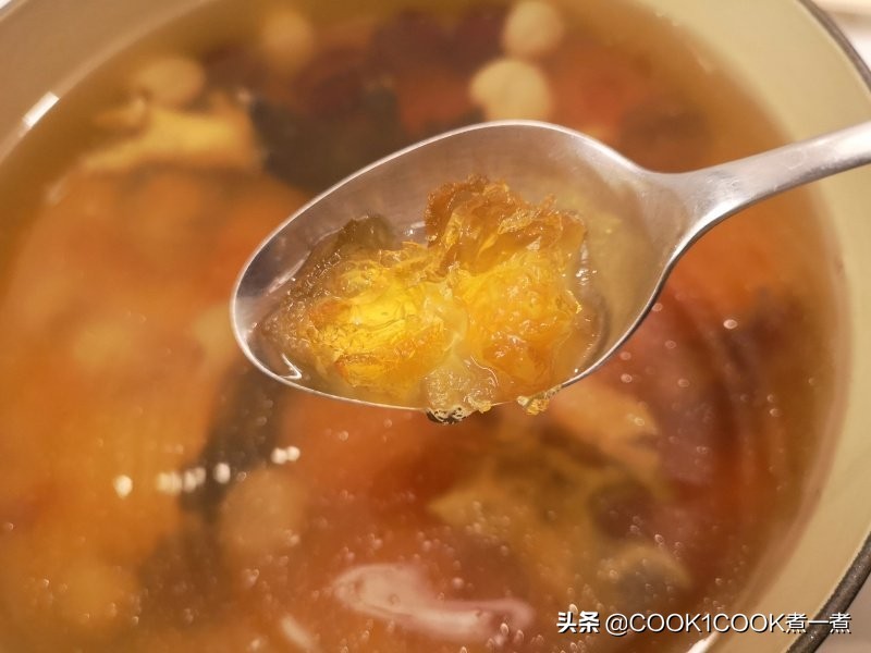 3、 1小时后加入桃胶煲半小时。
