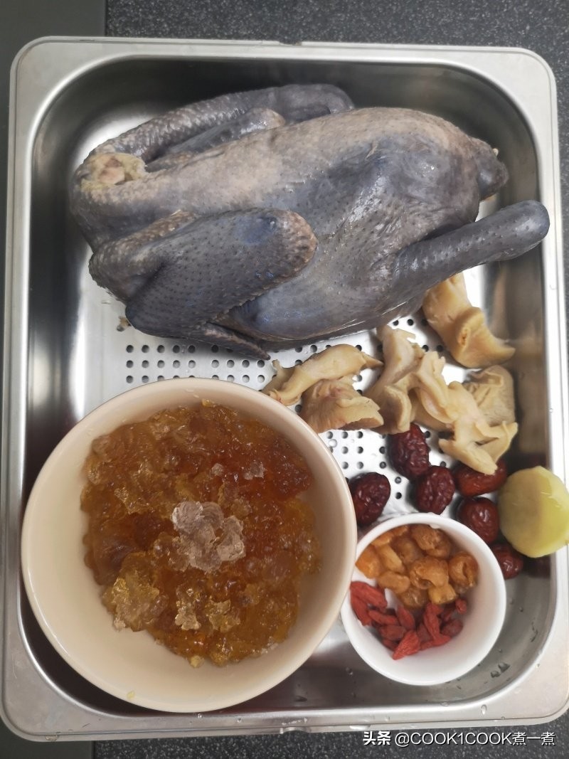 乌鸡1只干响螺头5旧红枣6粒龙眼肉十几粒姜片几片桃胶30克