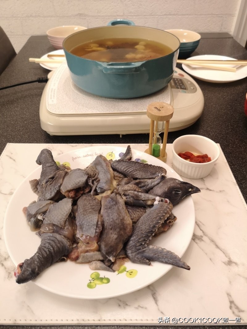 2、除杞子、桃胶和鸟鸡件外(不包括鸡脚),其余材料煲1小时。