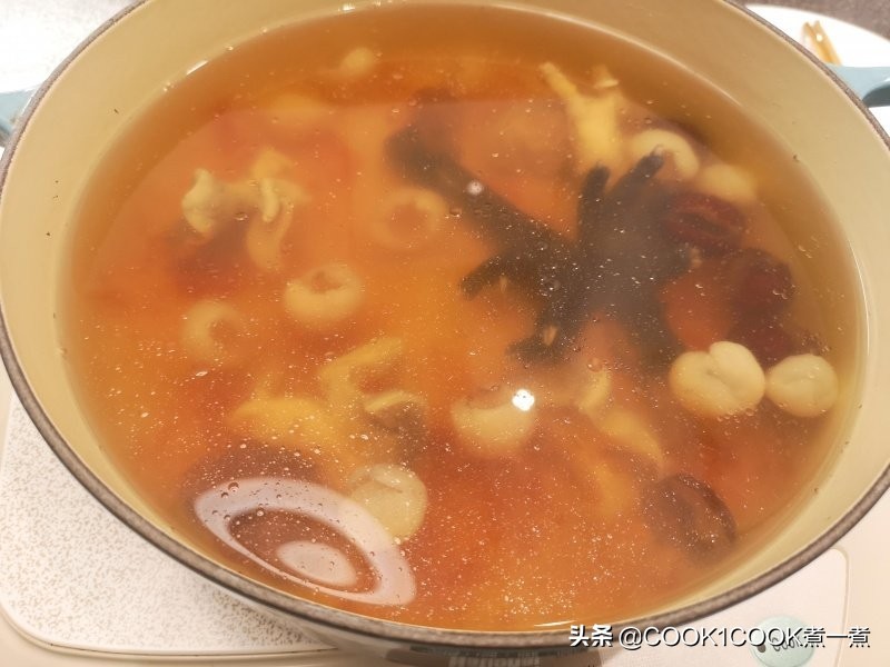 1、干响螺浸软身去内藏,桃胶浸过夜或浸十小时,红枣浸软去核,龙眼肉冲洗干净,杞子浸软。(可加淮山和党参。)