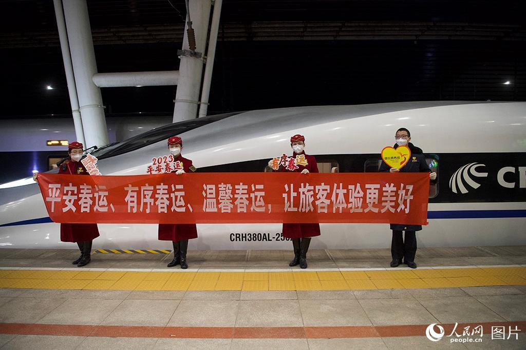 2023年春运大幕正式拉开,乘务组拉横幅祝福旅客旅途顺利。人民网记者 于凯摄