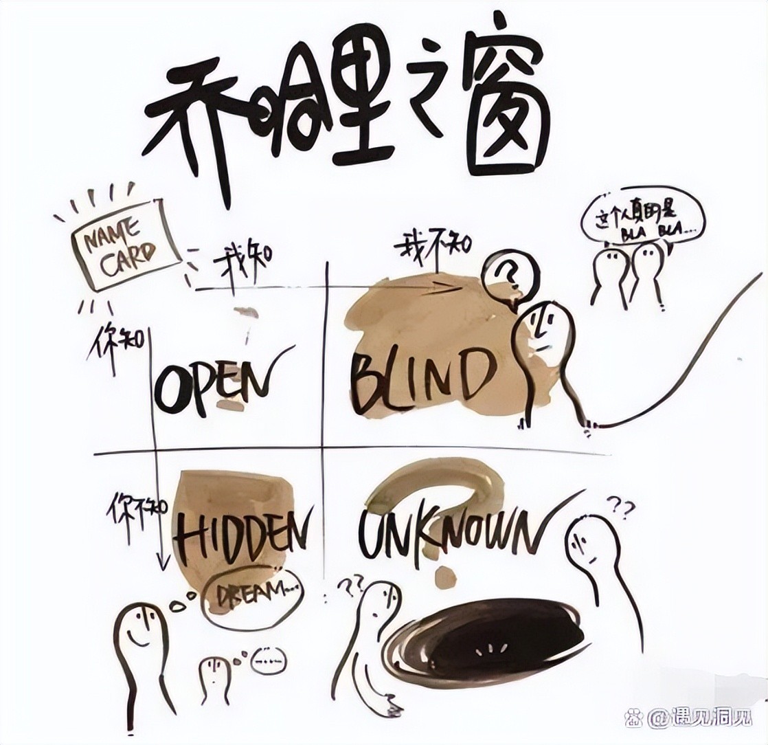 未知区:自己和别人都不知道的信息。未知区是尚待挖掘的黑洞,他对其他区域有潜在的影响。