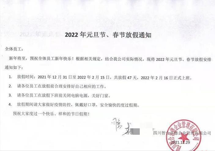8月才开张,现在就放假,一放就放47天!成都某公司近日的从元旦——春节——元宵的连续放假通知,羡煞众多网友。