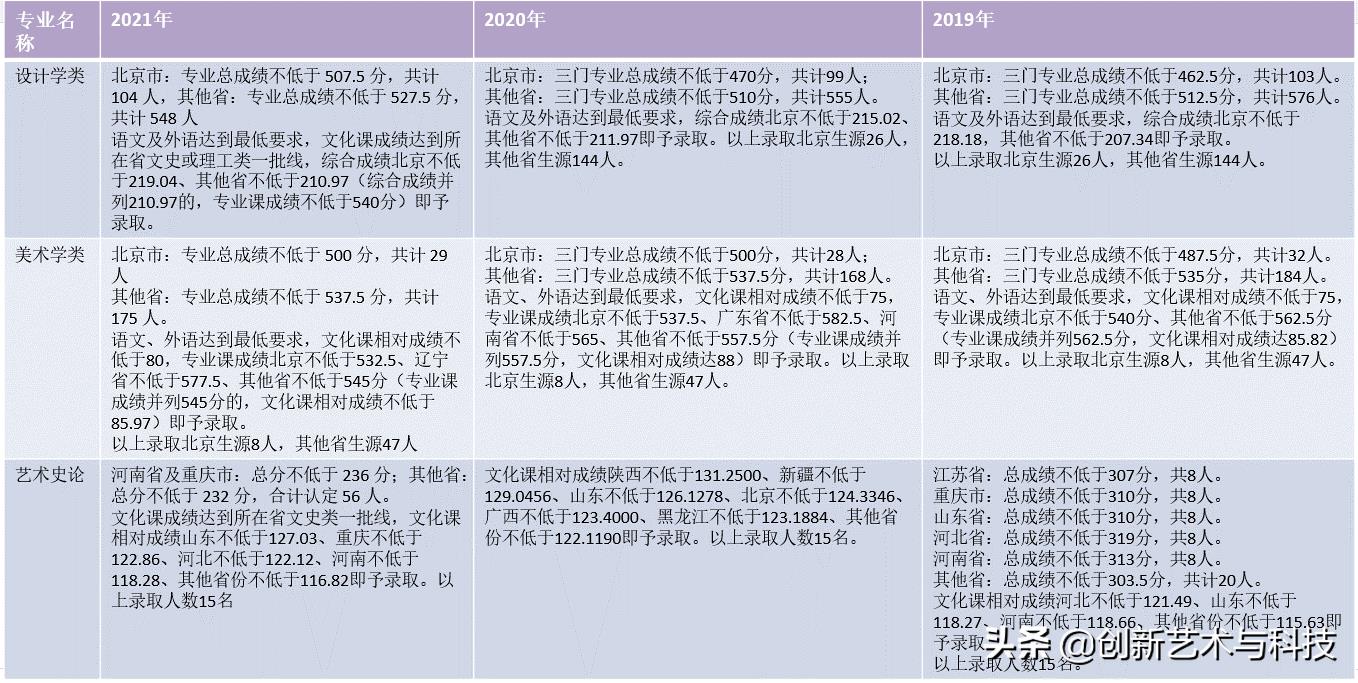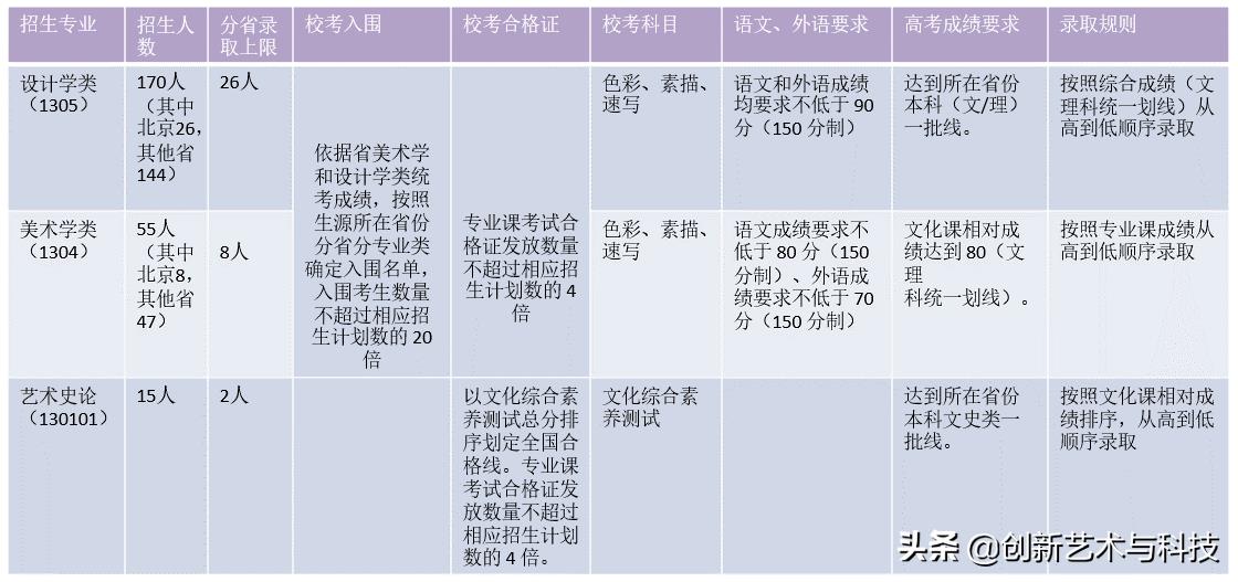 设计学类与美术学类:北京市录取人数占各专业全国招生计划的15%,即设计学类录取26人、美术学类录取8人(如合格生源不足,则将剩余专业计划调入其他省份);其他省份录取人数占各专业全国招生计划的85%,即设计学类录取144人、美术学类录取47人,其中每个省录取人数设计学类不超过26人、美术学类不超过8人,超过上限的省份单独划定录取线。艺术史论:全国统一录取,其中每个省录取人数不超过2人,超过上限的省份单独划定录取线。