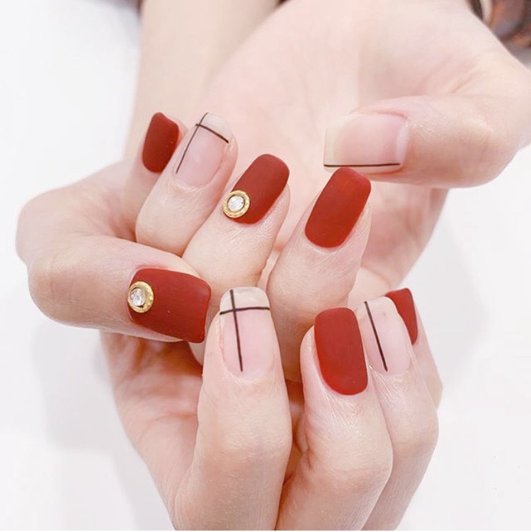 今年磨砂风着实是很火,纯色磨砂美甲搭配简单的黑色线条,红色磨砂秋冬很显白,搭配简单的黑色线条让人感觉没有那么鲜艳,或者同色系的颜色做跳色,简单又显得不单调,不喜欢太复杂的仙女们可以试试磨砂跳色美甲。