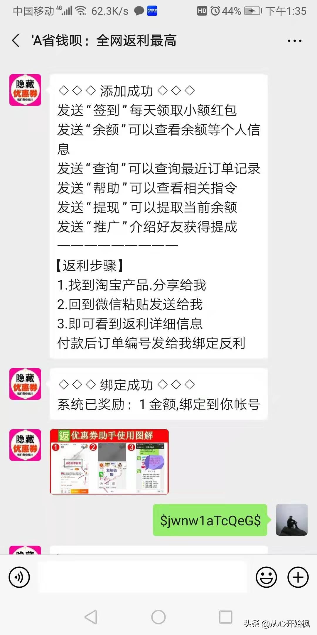现在,我们捋一下流程:分享自己淘宝选中的宝贝给返利机器人,机器人会自动回复你一个消息,然后长按这条消息复制,回到淘宝下单就可以获得返利。