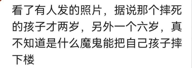 这起事件震撼了社会,引发了广泛的猜测。有人认为孩子是被扔下去的,表达出愤怒和不理智的行为。还有人认为可能是家庭矛盾激化,导致孩子被母亲扔下楼。也有人猜测与债务问题有关,母亲可能无法承受债务压力,决定以极端方式逃避债务,但又不忍心让孩子受苦。还有一种观点认为母亲可能患有抑郁症,想要结束自己的生命,但又放不下两个孩子。