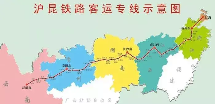 沪昆高速铁路由沪杭客运专线、杭长客运专线以及长昆客运专线组成,途经上海、杭州、南昌、长沙、贵阳、昆明6座省会城市及直辖市,沪昆高速铁路是中国东西向线路里程最长、经过省份最多的高速铁路,是国家规划的"四纵四横"综合运输大通道和"四纵四横"铁路客运专线网的重要组成部分 。