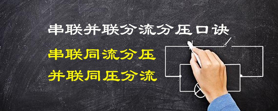 串联并联分压分流口诀是:串联分压同流;并联分流同压。即串联电路上任何位置上的电流都是相同的,串联电路上各电阻(包括用电器)两端电压的和等于电源的输出电压。并联电路上任何支路两端的电压都等于电源的输出电压,各支路的电流和等于干路的电流。