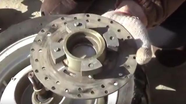 直接用这种专门鼓刹改碟刹的套件把原来的刹车片去掉。它的原理是根据碟刹盘上面那个螺丝拧紧下面的四个蹄块涨开。所以安装的时候一定要将碟刹盘和转子的外圈齐平,不能有间隙。我们将这个碟刹盘上面的四颗内六角螺丝,按照对角的方式拧紧,确保碟刹盘牢固以防止没有刹车。