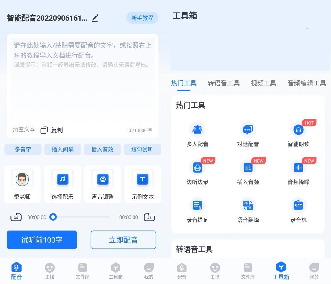 这款软件的主打功能是智能配音,里面涵盖了上百种音色供我们挑选,能应用在视频旁白解说、商场叫卖、课程录制等多种场景。而且它还有音频转文字、AI虚拟主播、音频合并、图片翻译等实用功能.