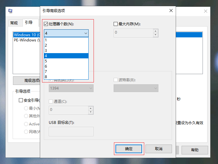 切换到【引导】选项卡,选择【高级选项】,把【处理个数】由默认的1改为4,或者更大,最后点击【确定】即可。