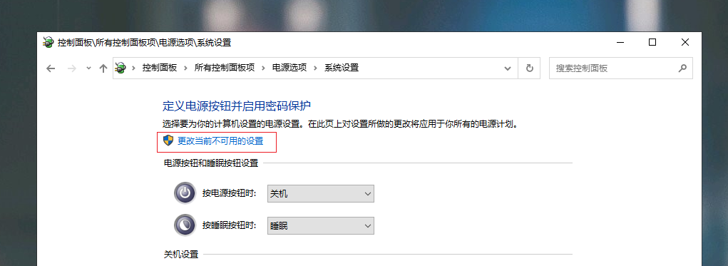 进入后,在左边选择【选择电源按钮的功能】,然后点击【更改当前不可用的设置】。