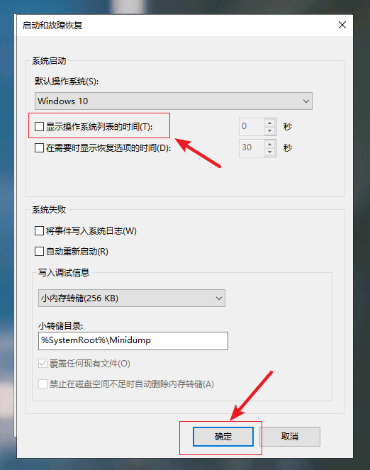 在以下界面,把【系统启动】下的【显示操作系统列表的时间】前面的勾去掉,然后点击【确定】。